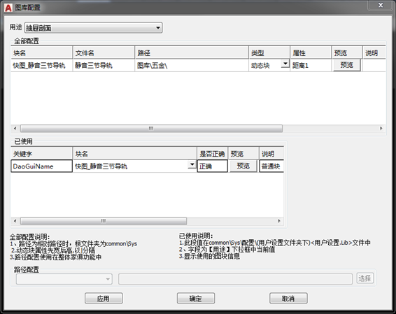 B、全部配置:即在此用途上,保存在【common\Sys\配置\快图配置(KTPZ)\ 块名配置.Lib】 文件中该用途字段中的配置。如: